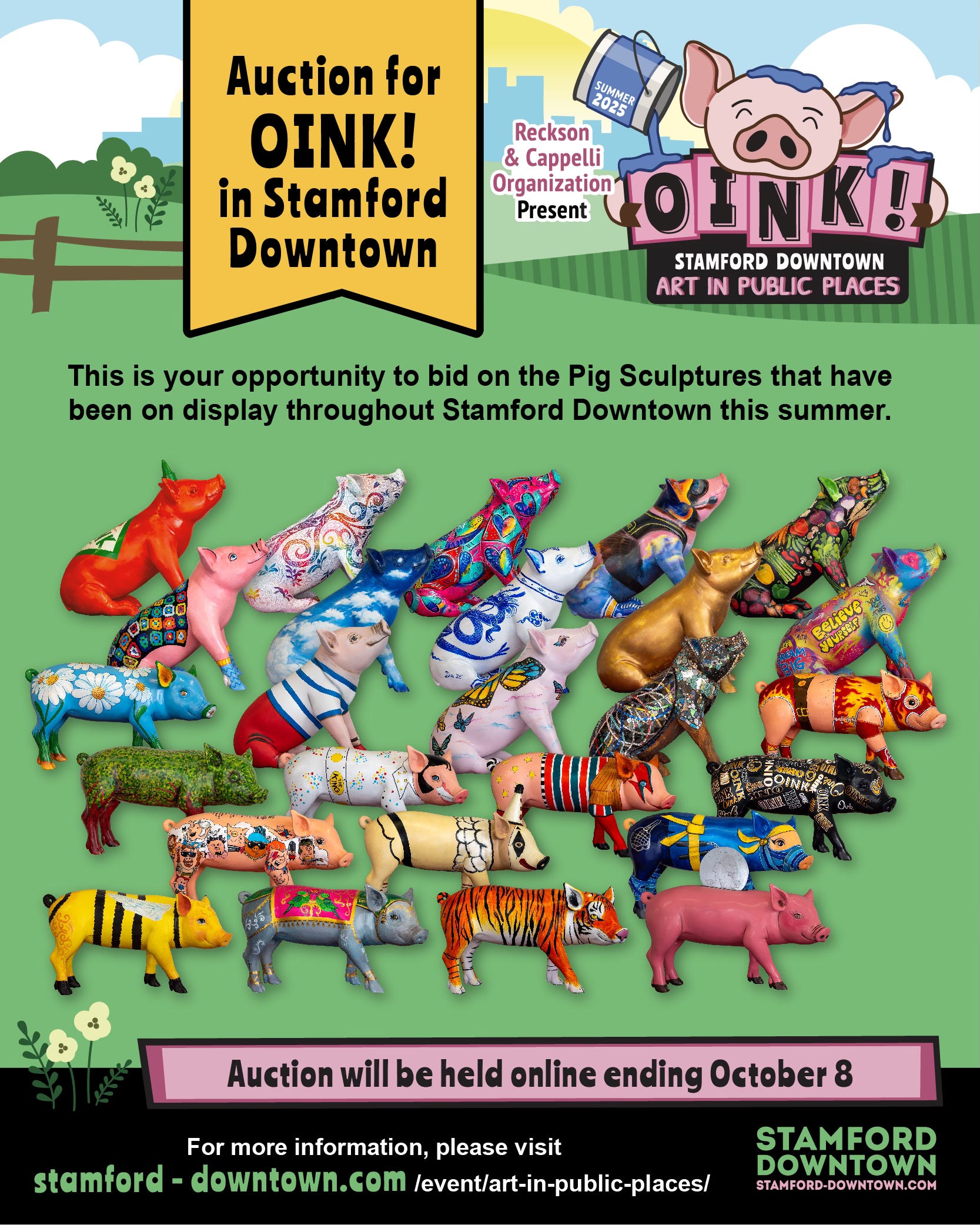 The OINK! exhibit is presented by Reckson and the Cappelli Organization. Sponsors include Block by Block, Cummings & Lockwood LLC, Eastern Land Management, George Comfort & Sons, Inc., M&T Bank, MarLo Associates, Inc., and Pan Am Equities with support from the City of Stamford, Happyhaha Photography, Hey Stamford!, Star 99.9, WEBE 108, and WICC.