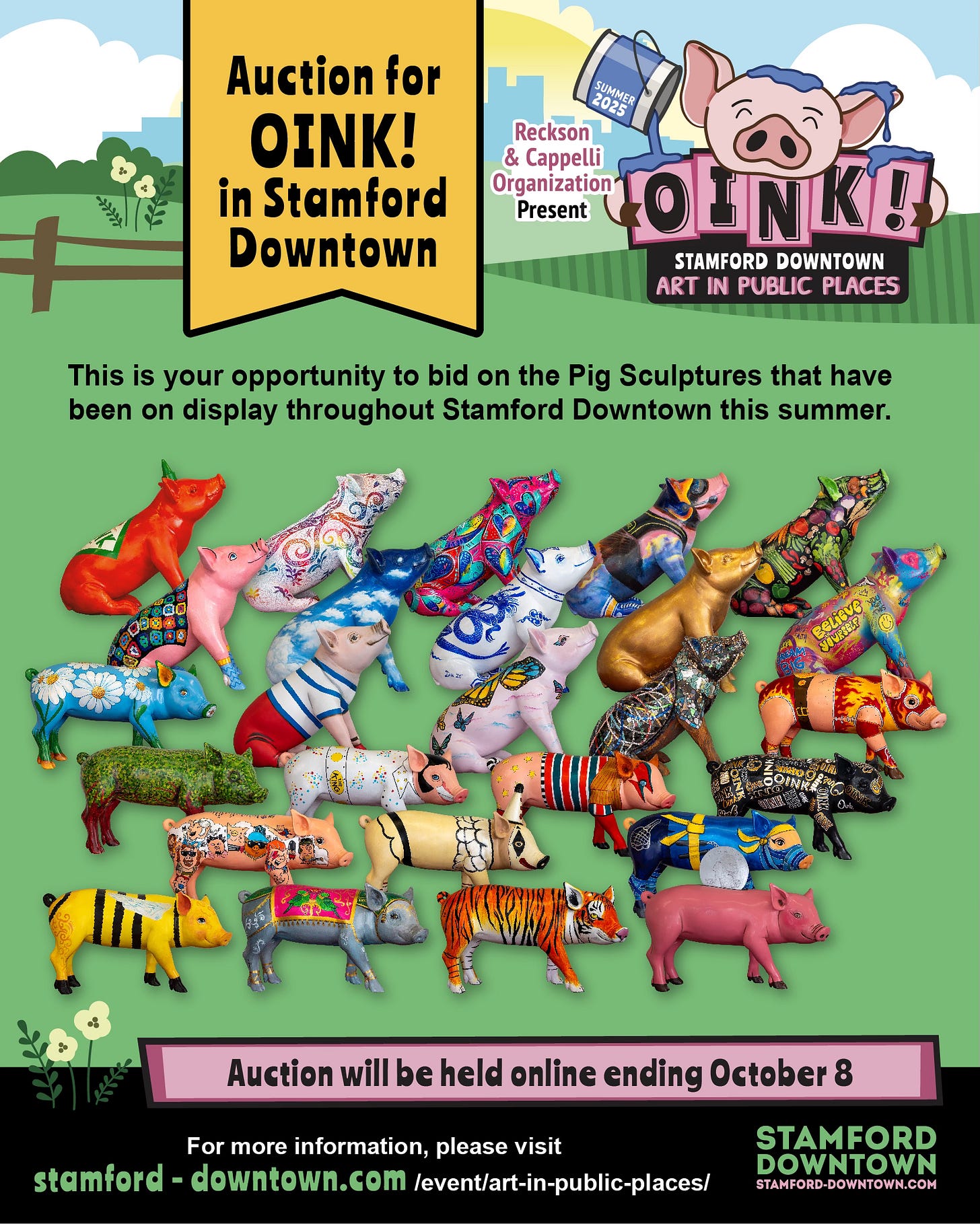 This year’s popular OINK!, Art in Public Places installation produced by Stamford Downtown will officially come to an end after three months on Sunday, September 21, according to a press release. The city’s downtown business development district introduced more than two dozen fiberglass pieces of porcine artwork in early June.
