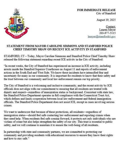 More than a week after the initial ICE arrests in Stamford, Mayor Caroline Simmons and Police Chief Timothy Shaw released a joint statement reiterating that the city does not cooperate with ICE besides when responding to serious crimes.