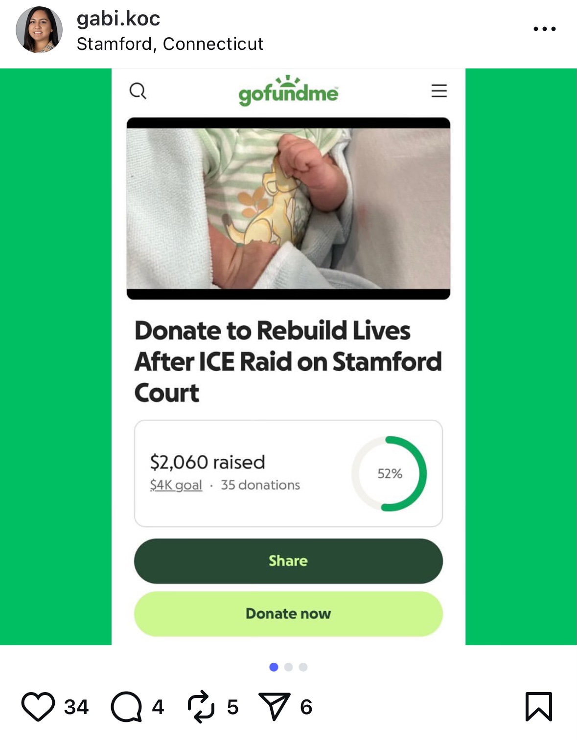 Stamford Board of Education member Gabriela Koc shared a GoFundMe fundraiser organized by Nosotr@s Connecticut, a nonprofit organization in the state, in support of two young mothers directly impacted by the ICE raids.