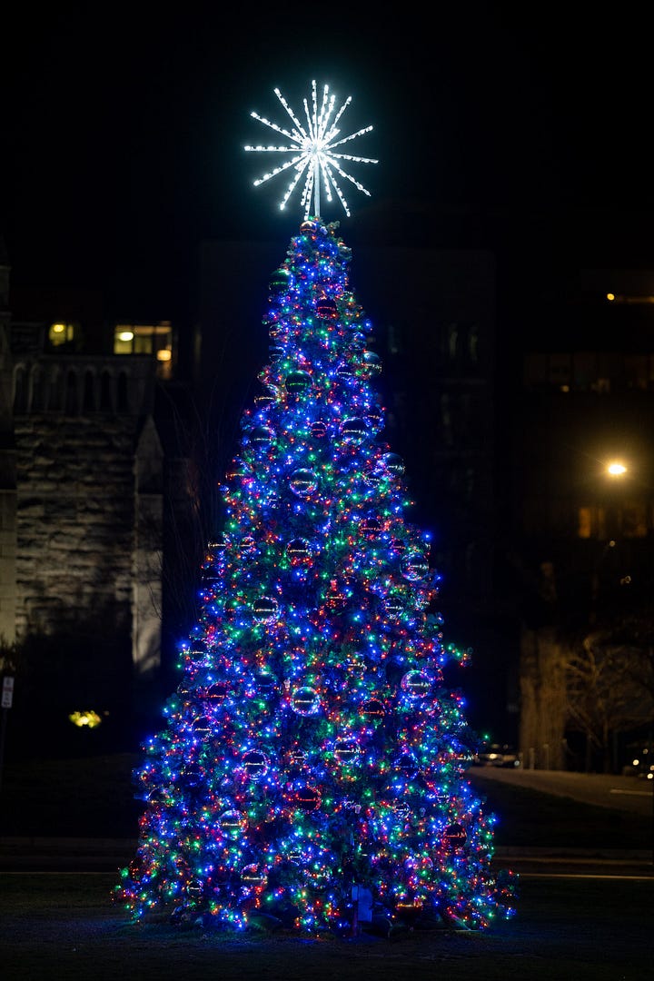 Multi-color displays on two grand oak trees at the Ferguson Library and in Columbus Park, the latter of which features 63,000 lights.