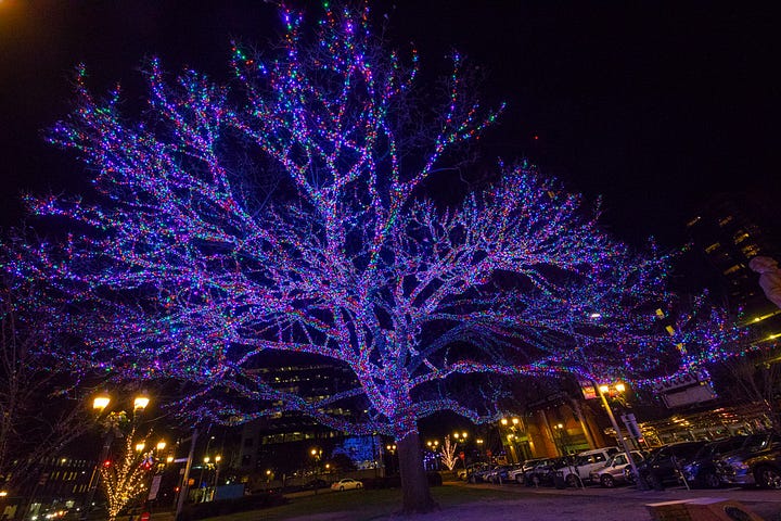 Nearly seven dozen street trees covered with approximately 1,700 lights each along Atlantic, Bedford, Atlantic, Main, and Summer Streets.