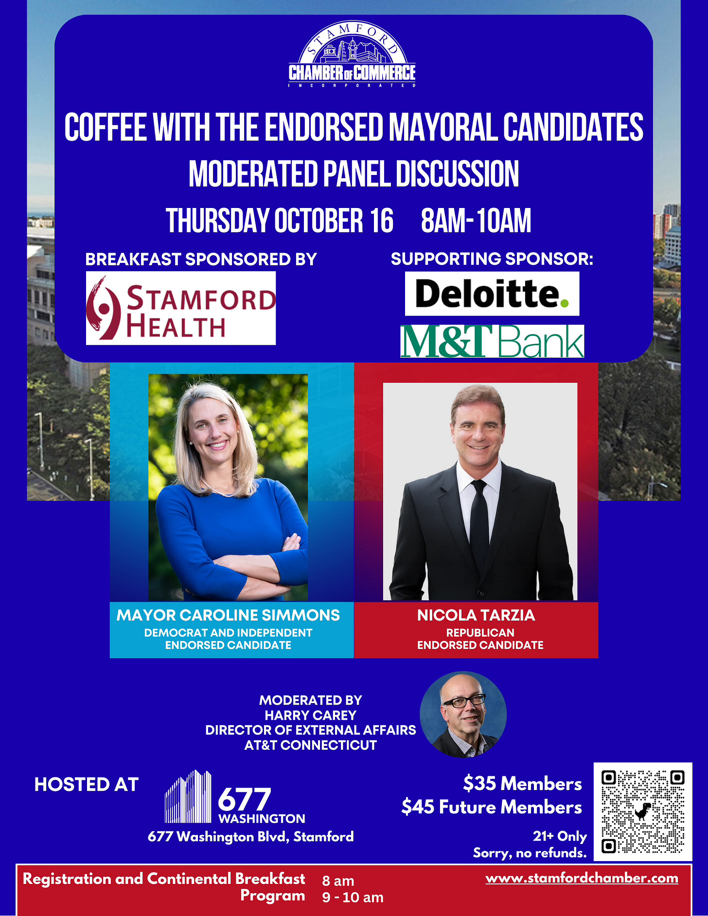 Simmons and Tarzia will participate in a moderated panel discussion that the Stamford Chamber of Commerce is convening on Thursday, October 19, from 8:00 am to 10:00 am at The Town Hall at 677 Washington.