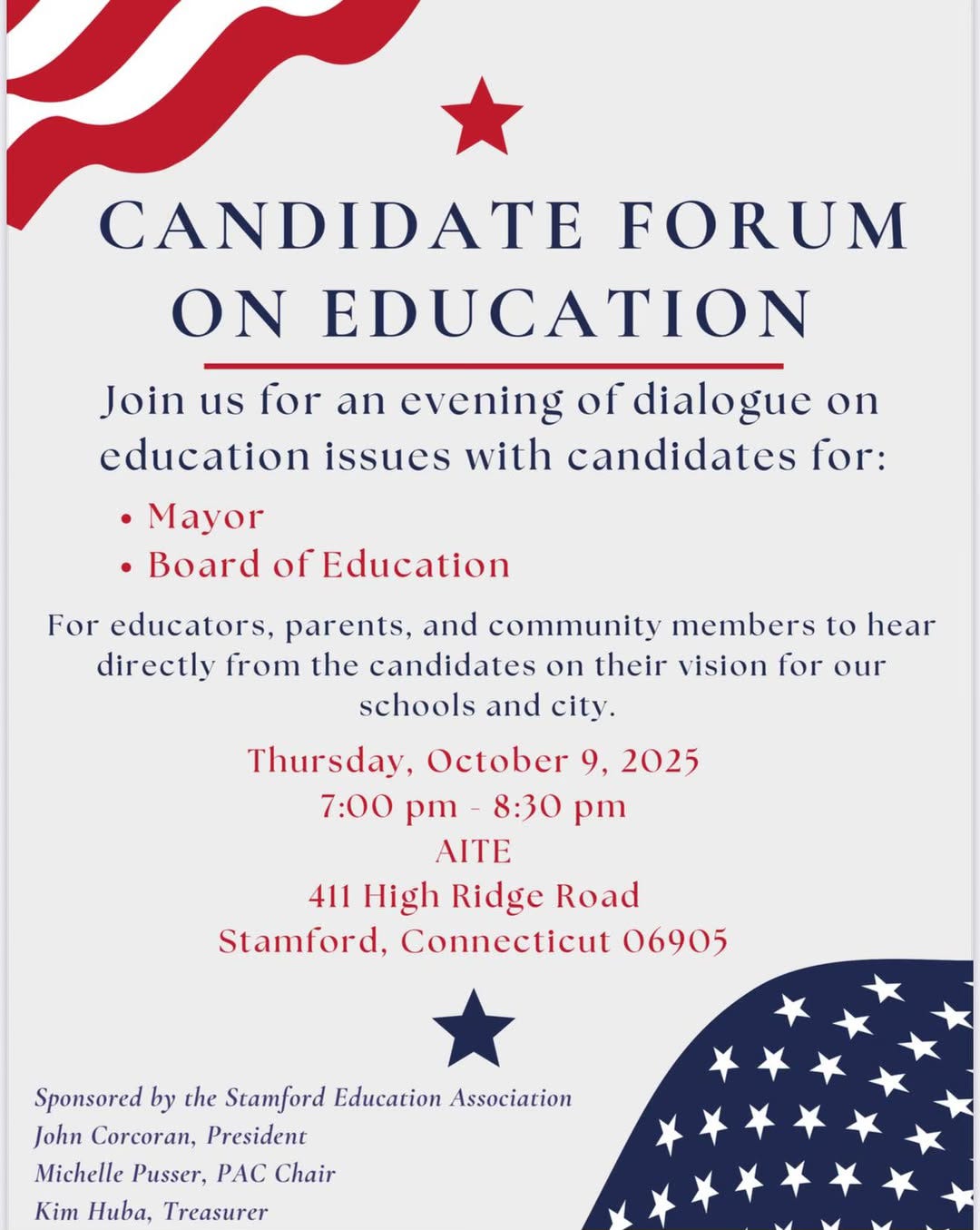The Stamford Education Association (SEA) will hold an education-focused forum at the Academy of Information Technology & Engineering (AITE) on Thursday, October 9, from 7:00 pm to 8:30 pm.